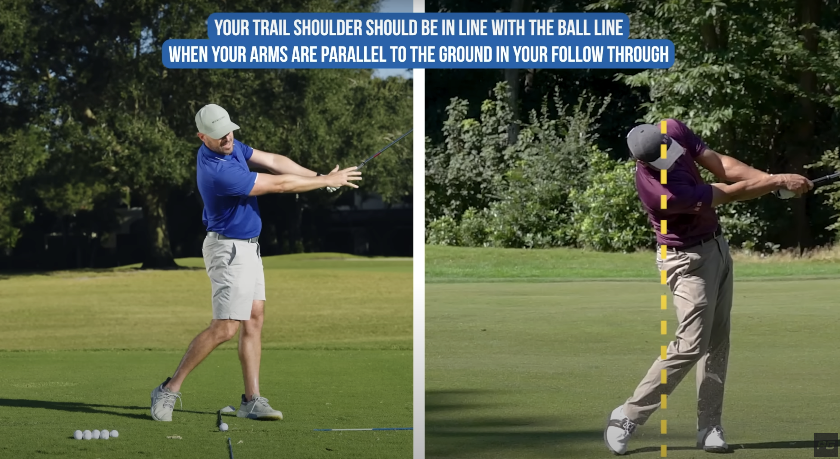 To determine whether you’re executing the correct motion, use this simple checkpoint: by the time your arms reach parallel in the follow-through, your trail shoulder should be in line with the golf ball (see below).