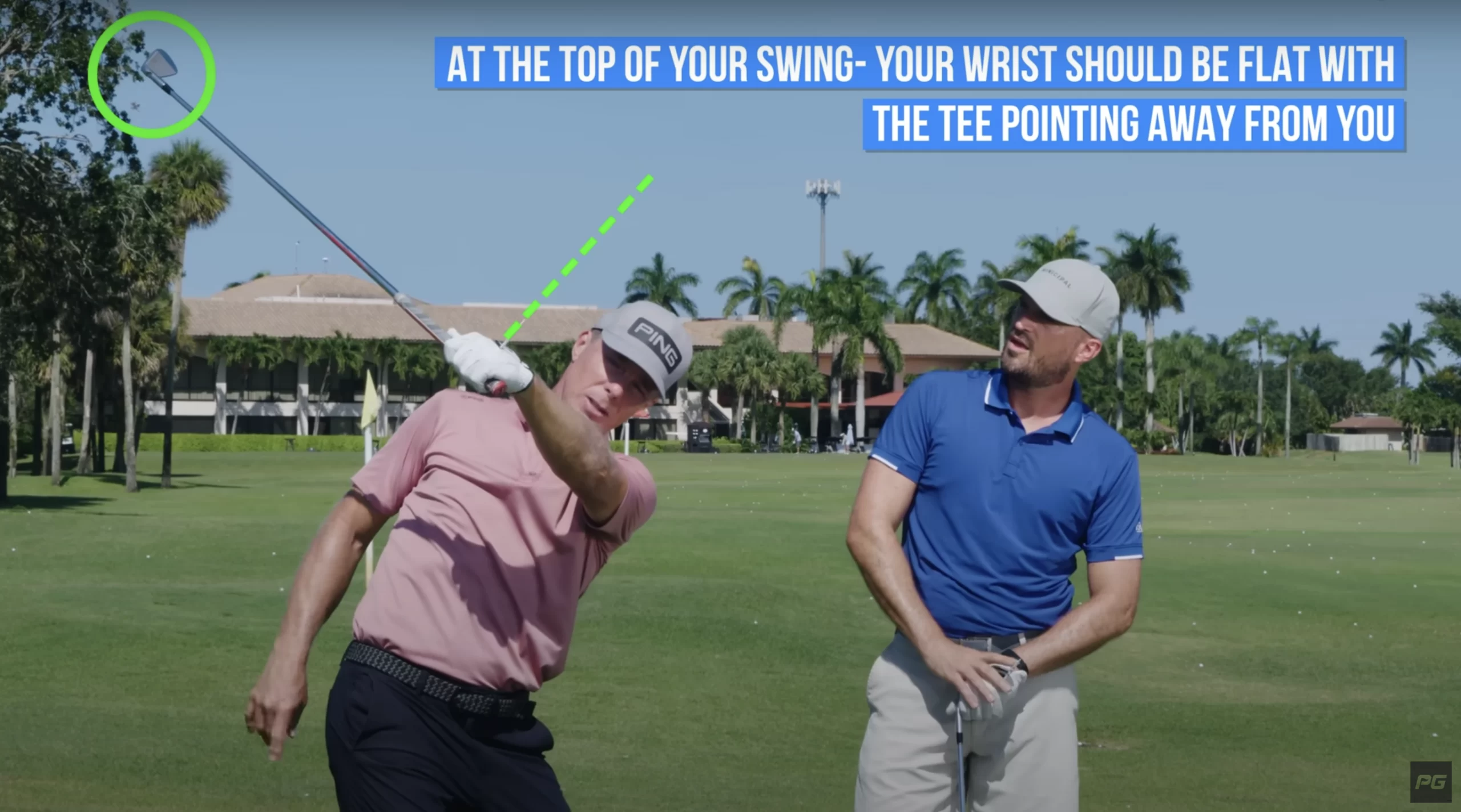 It’s important to take mental notes throughout the swing of some key checkpoints. In the takeaway, the clubface should be slightly closed, with the tee pointing downward. At the top of the backswing, the tee should point up and away from the golfer, avoiding an open clubface.