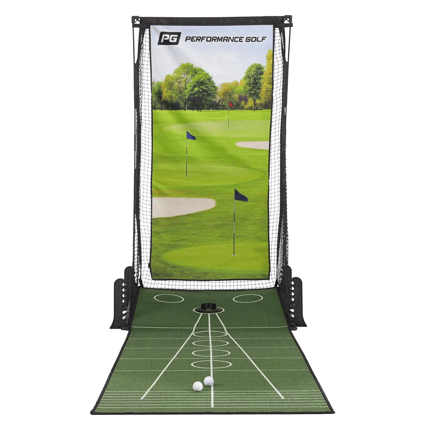 Dial in your putting from 3 to 9 feet and move the cup to seven different locations to simulate distance, break, and real-life knee-knockers you’ll face on the course! - PITCH-SAFE NETTING & SAVE-SPACE STORAGE